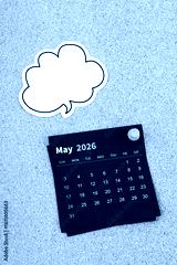 May 2026 Black calendar page and blank speech bubble with thumbtack on wooden board.