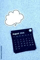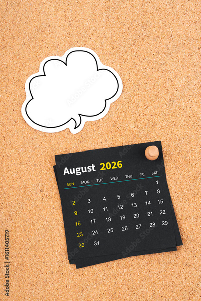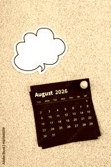 August 2026 Black calendar page and blank speech bubble with thumbtack on wooden board.