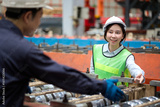 Engineer or worker talking and meeting with coworker in the metal sheet factory