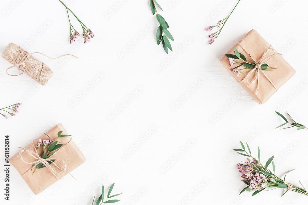 Flowers composition. Gifts, pink flowers and eucalyptus branches on white background. Flat lay, top view