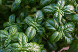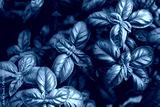 Fresh green basil leaves grown in cultivation, close-up texture image representing organic farming and aromatic herbs.