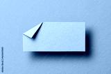 Blue blank paper note cardboard with folded corner dog-ear earmark, shadow and copy space for text on pink background