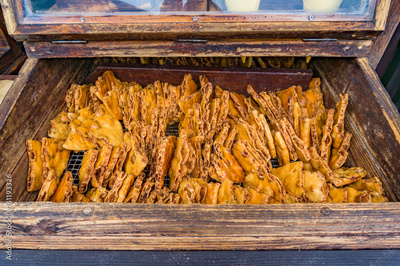 Traditional Japanese snacks Rice crackers in wooden box