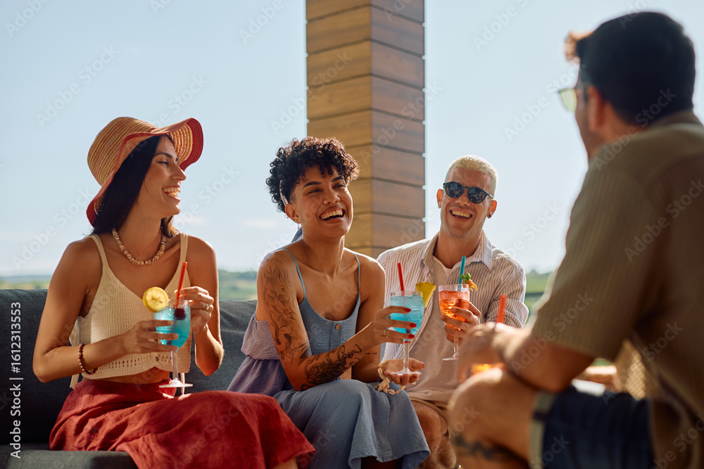 Young carefree people laughing and having fun while drinking cocktails in summer day.