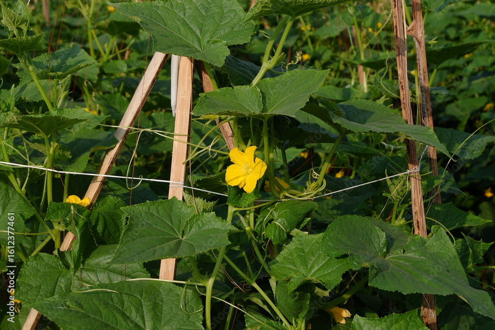 Yellow Flowering Cucumber Plant with Green Leaves in a Garden Setting