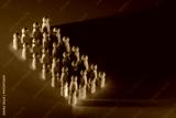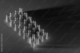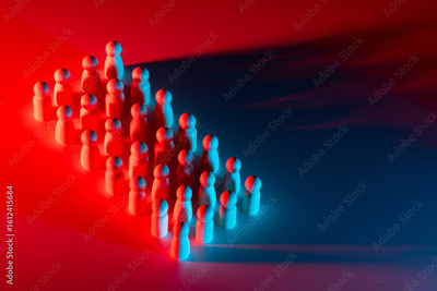 Group of wooden figures arranged in a triangle under red and blue lighting, symbolizing leadership, hierarchy, teamwork, or organization. Business, HR, Strategy, Leadership.