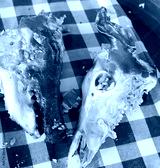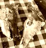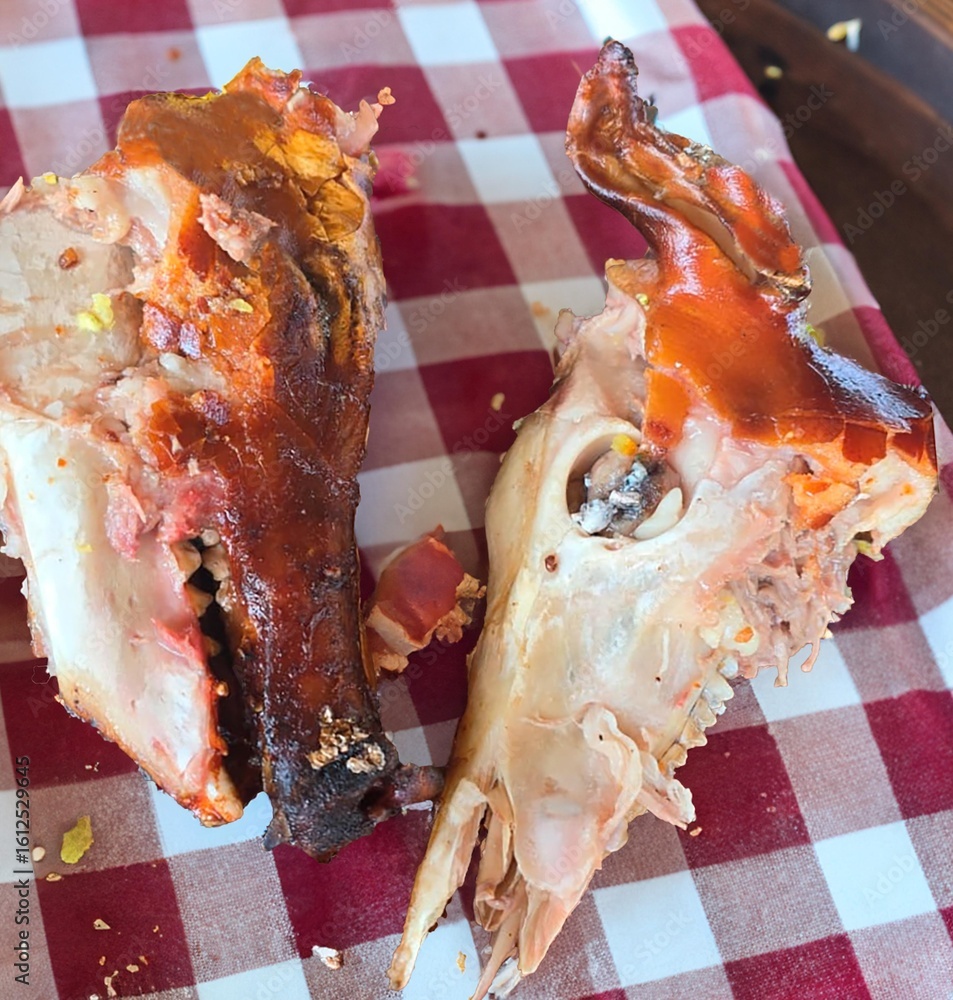 Roasted pig head halves on a white plate. The most exotic and rustic food in the world, baked pork head