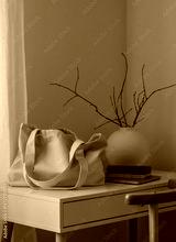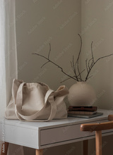 A shopping bag, a notebook, a vase with branches on a white table in the living room. Cozy minimalistic interior