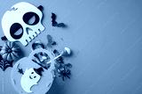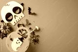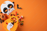 Colorful Halloween-themed composition featuring candy, decorations, and seasonal items on an orange surface