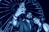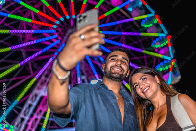 Happy couple taking selfie in front of ferris wheel at night