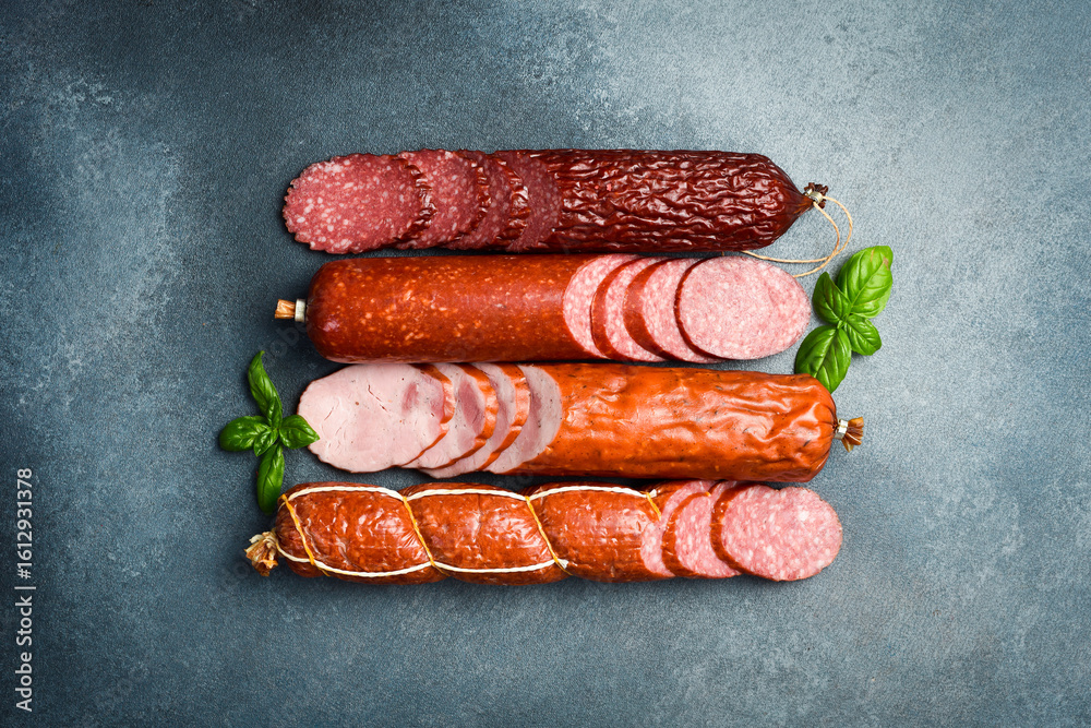 Food background. Salami, pepperoni and smoked sausages cut into slices. Top view. Free copy space.