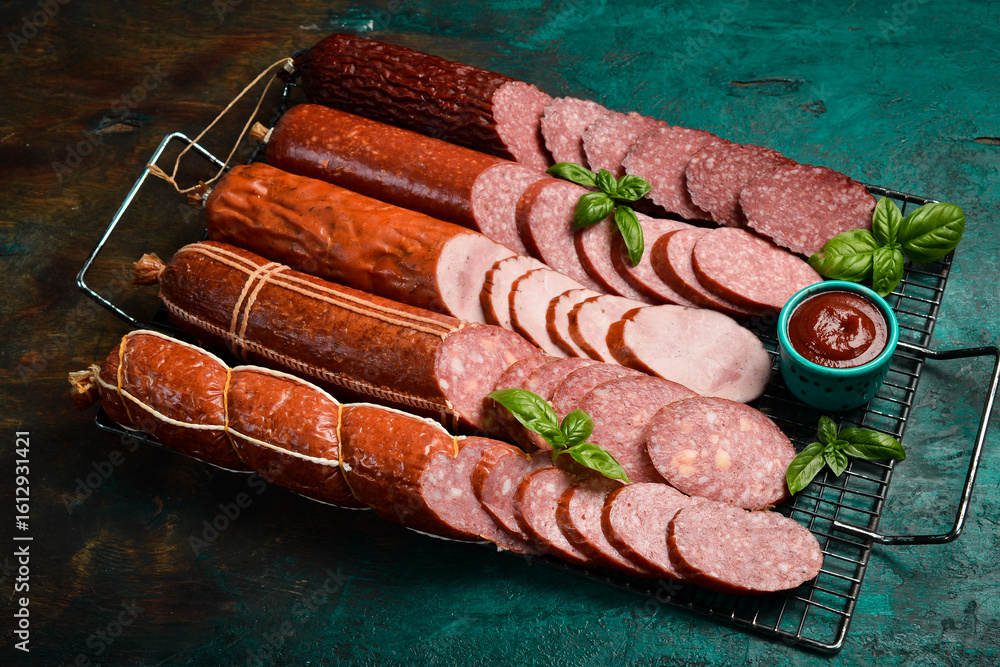 Food background. Salami, pepperoni and smoked sausages cut into slices. Top view. Free copy space.