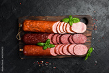 Homemade smoked dry sausages on a wooden cutting board. On a black stone slate background.