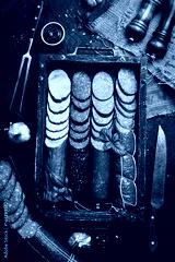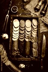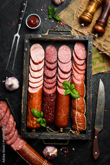 Different types of homemade smoked dry sausages on a dark wooden background. Assortment of delicious deli meats, salami and pepperoni on a tray.