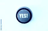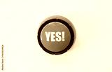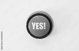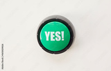Photorealistic image of a green push button with bold white letters spelling YES! placed on a clean white background. Symbolizes agreement, confirmation, approval, positivity, or humorous feedback.