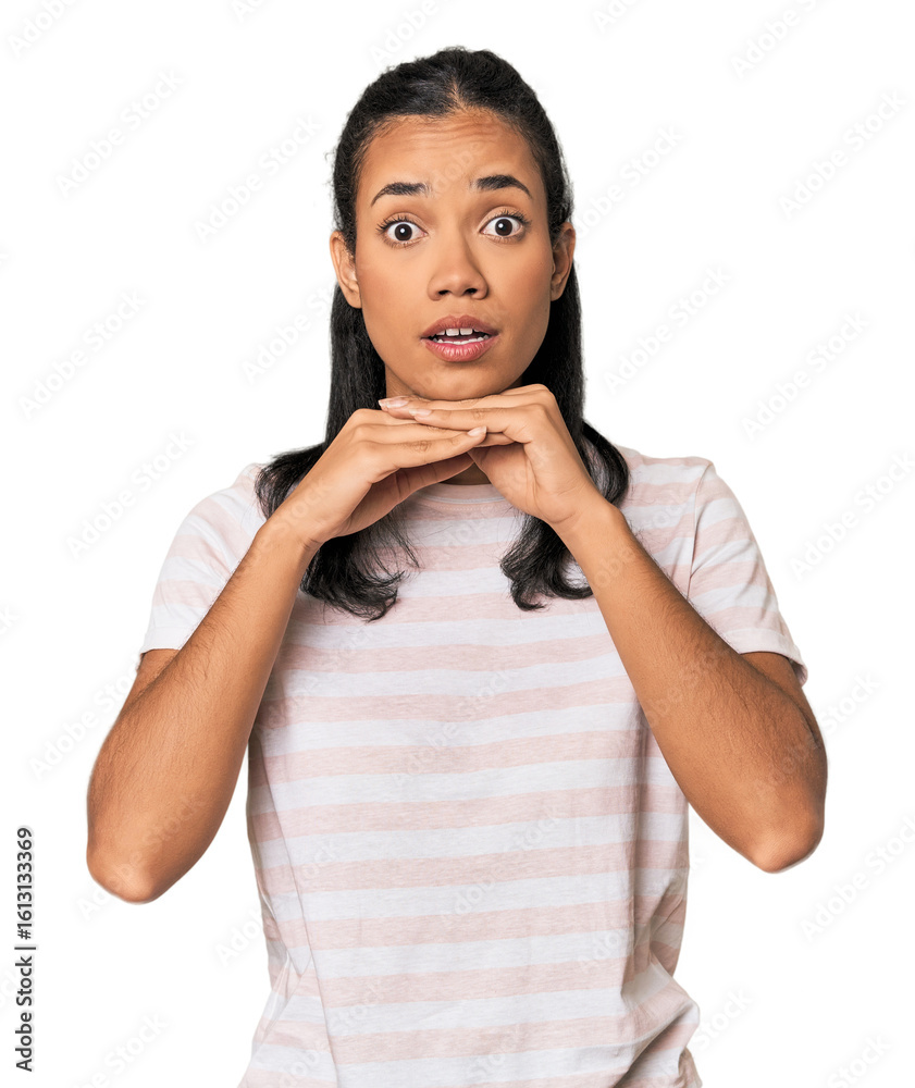 Young Filipina woman praying for luck, amazed and opening mouth looking to front.