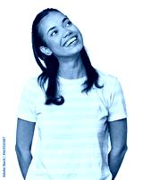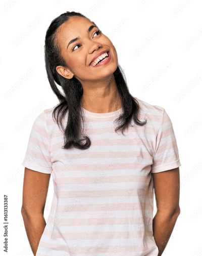 Young Filipina woman relaxed and happy laughing, neck stretched showing teeth.
