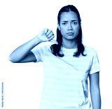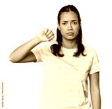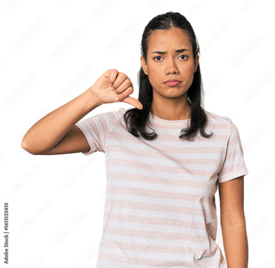 Young Filipina woman showing a dislike gesture, thumbs down. Disagreement concept.
