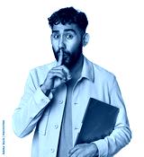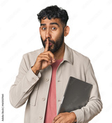 Hispanic male holding laptop in studio keeping a secret or asking for silence.