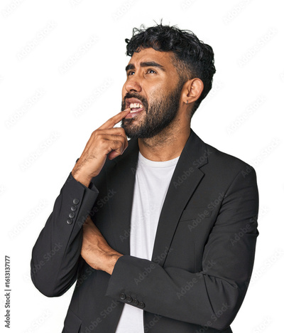 Hispanic businessman in suit in studio looking sideways with doubtful and skeptical expression.