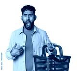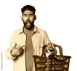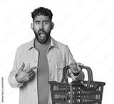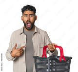 Hispanic male holding shopping basket in studio pointing to the side