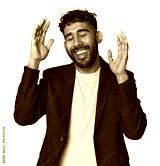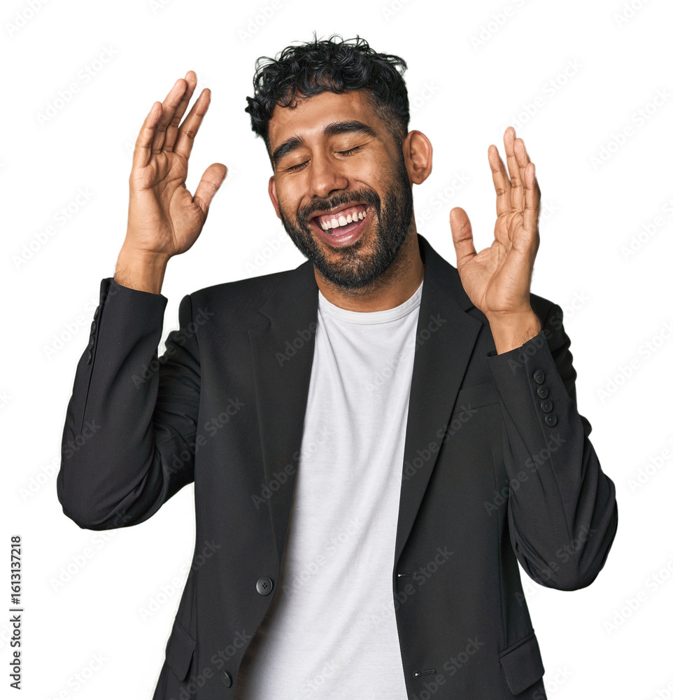 Hispanic businessman in suit in studio joyful laughing a lot. Happiness concept.