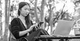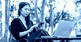 Portrait of young girl using laptop and a phone while sitting in the park