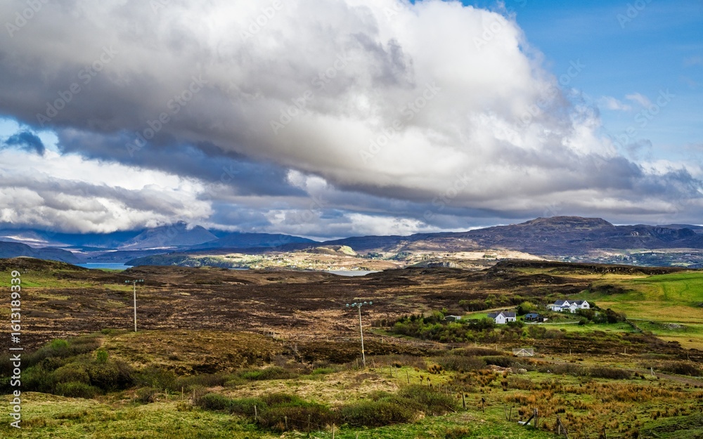 Farms over Loch Harport, Drynoch, Isle of Skye, Scotland, UK