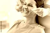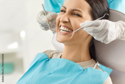 Close-up portrait of female patient with open mouth in modern dentistry clinic during medical check up in medical center. Dentist examining young woman teeth with dental tools. Dental health care.