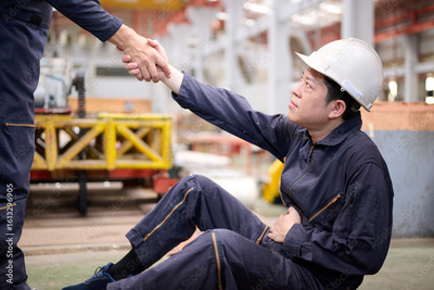 Technician helping his friend to get up after a break in the factory