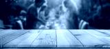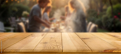 Grilling time – summer barbecue setup with copy space for product. Blurred background of group of friends or family enjoying relaxed garden party, sharing food and laughter in warm summer atmosphere.