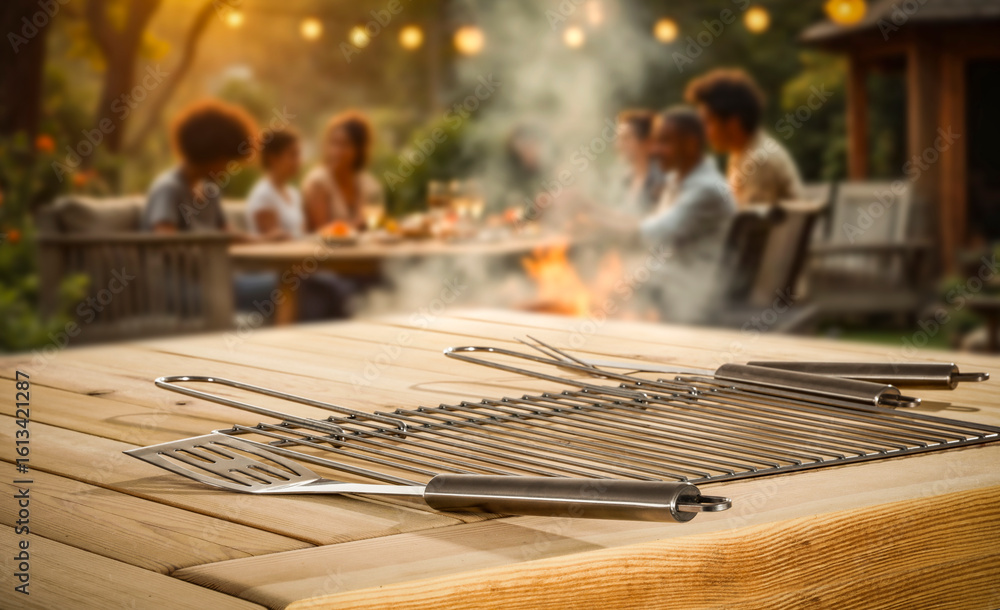 Grilling time – summer barbecue setup with copy space for product. Blurred background of group of friends or family enjoying relaxed garden party, sharing food and laughter in warm summer atmosphere.
