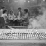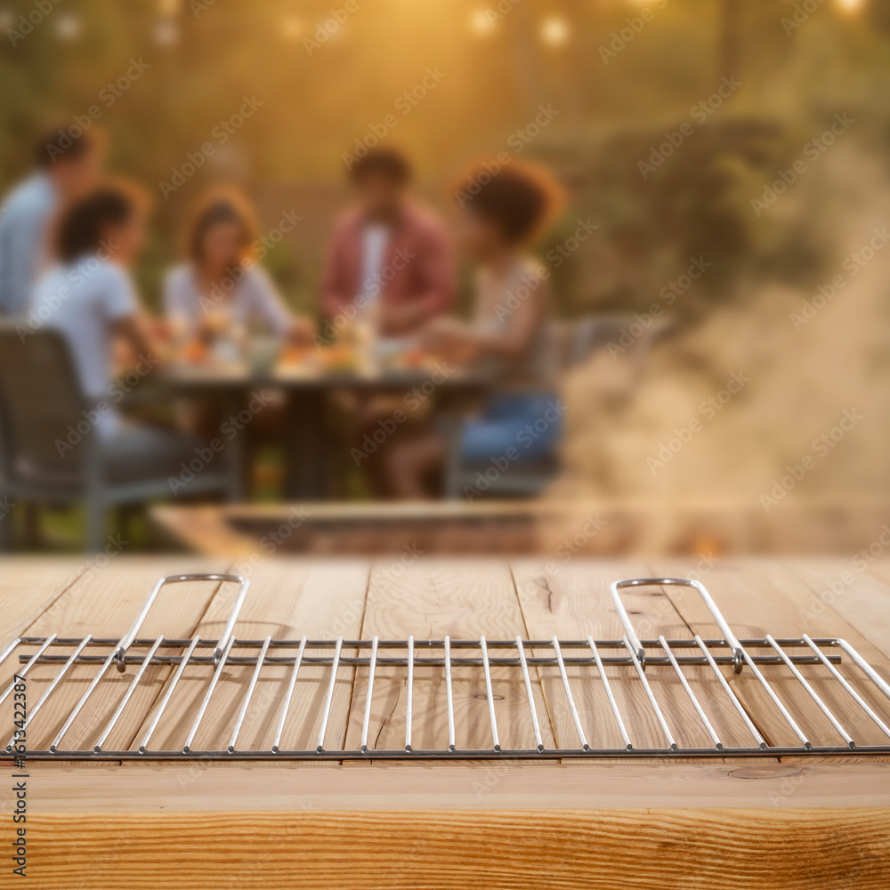 Grilling time – summer barbecue setup with copy space for product. Blurred background of group of friends or family enjoying relaxed garden party, sharing food and laughter in warm summer atmosphere.