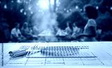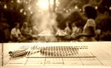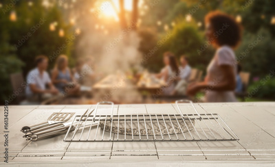 Grilling time – summer barbecue setup with copy space for product. Blurred background of group of friends or family enjoying relaxed garden party, sharing food and laughter in warm summer atmosphere.