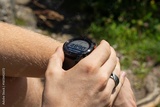 osoba mierząca parametry fizyczne podczas wycieczki górskiej.