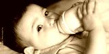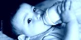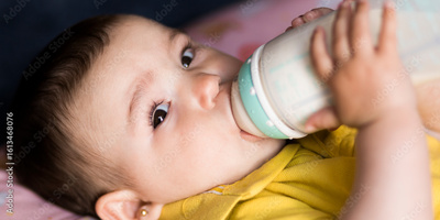 Infant drinking from feeding bottle, baby bottle feeding on bed, toddler holding milk bottle
