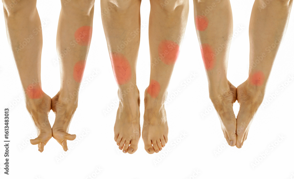 Sore legs with red pain points isolated on white – medical and therapeutic concept. Joint pain, muscle soreness, swelling, or circulation problems, health-related content, physical therapy materials.