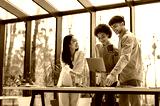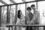 Teamwork. Business Team At Office Interior Working With Laptop And Papers Standing Around Table Together. Three Arabic, African And Asian Colleagues Websurfing Enjoying Professional Cooperation