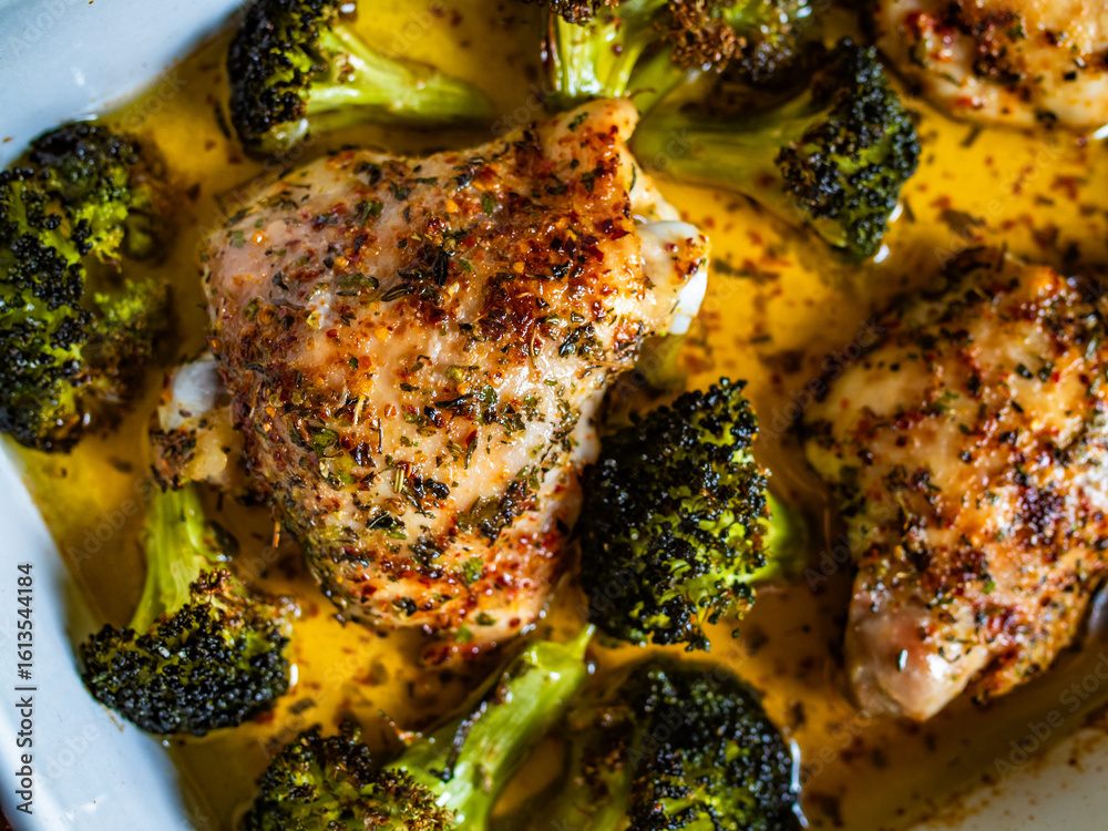 Baked chicken thighs and broccoli in baking dish on wooden table