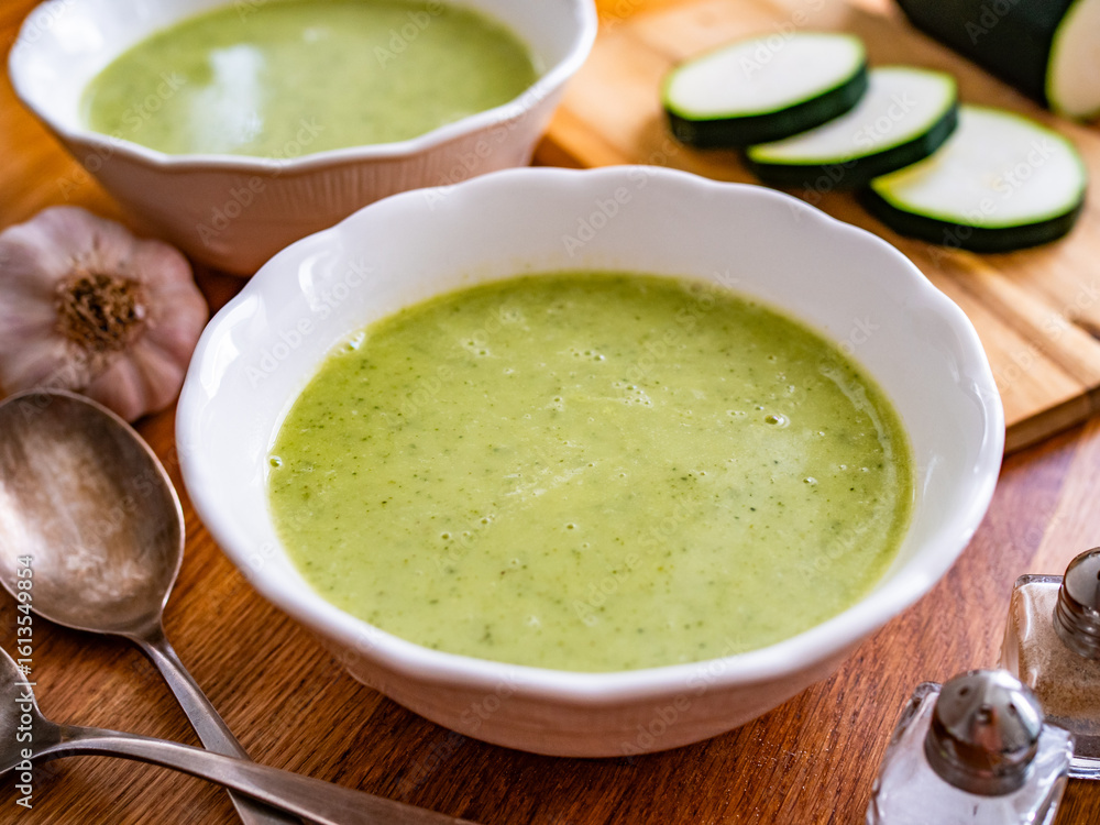 Cream of zucchini soup on wooden table