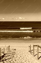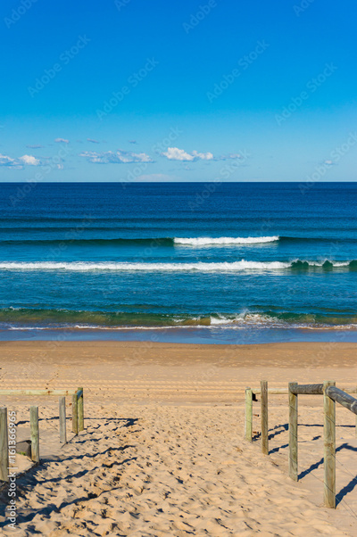 Beach entrance with wooden railings and ocean beach view