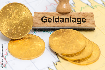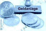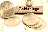 Ein Holzstempel ist beschriftet mit dem Aufdruck Geldanlage vor einigen echten Goldmünzen