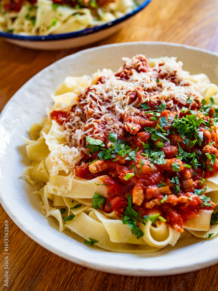 Tagliatelle con ragù alla bolognese - pasta with minced meat and tomato sauce on wooden table