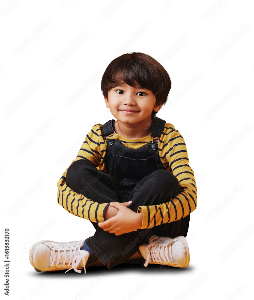 Portrait, fashion and a cute indian kid isolated on a transparent background for children fashion. Smile, innocent and adorable with a young boy sitting on PNG in an clothes outfit for youth style