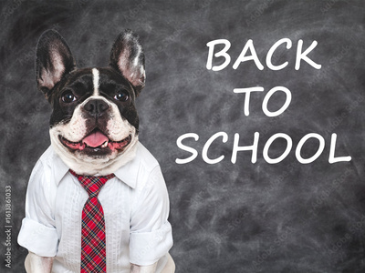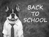 Back to school. Cute puppy and blackboard with inscription. Closeup, isolated background. Studio shot, day light. Concept of care, education, obedience training and raising of pet