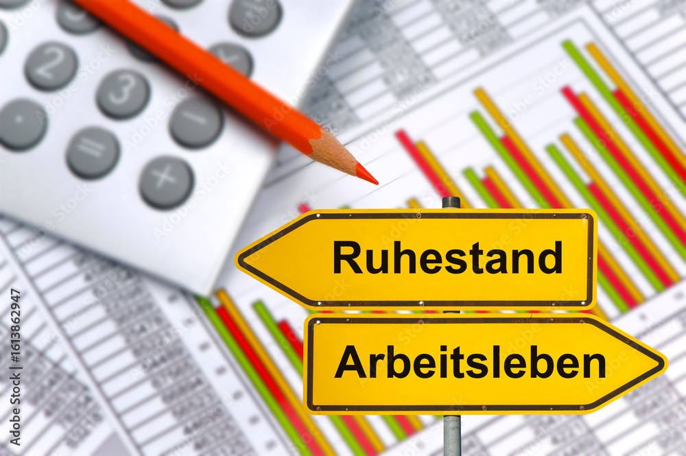Zwei Wegweiser zeigen in unterschiedliche Richtungen und sind beschriftet mit Ruhestand vs. Arbeitsleben vor einem Chart mit Kursen und einem Taschenrechner mit Rotstift - FOTOMONTAGE