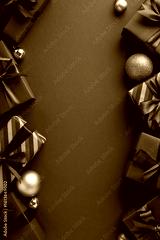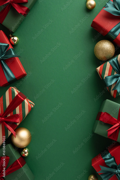 Festive vertical arrangement of wrapped Christmas gifts and glittering ornaments displayed on a green backdrop