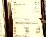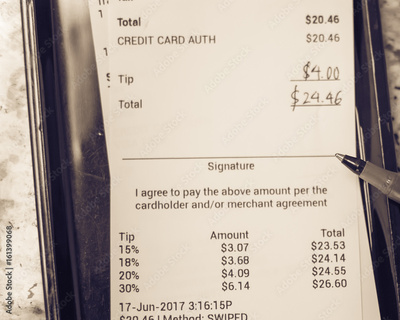 Soft focus, shallow DOF a receipt with hand written total amount and tipping from Vietnamese restaurant. Paper invoice with suggested gratuities/tips on plastic tray, open pen on top of marble table.