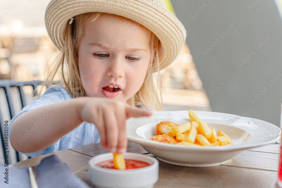 Little girl child eats French fries with ketchup in a cafe on the street.