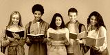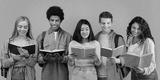 Modern education and teamwork. Happy young university students studying with books in library, group of multiracial people in college read, isolated on orange background, studio shot, empty space